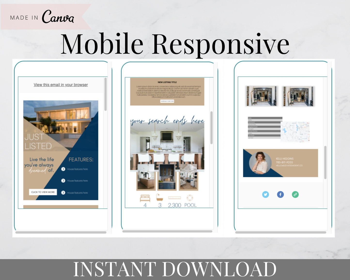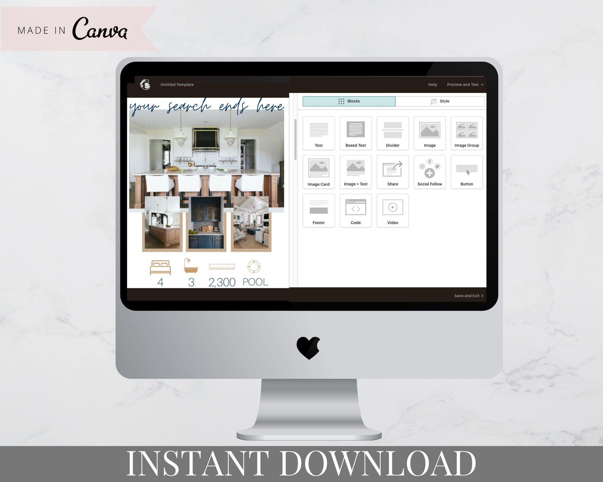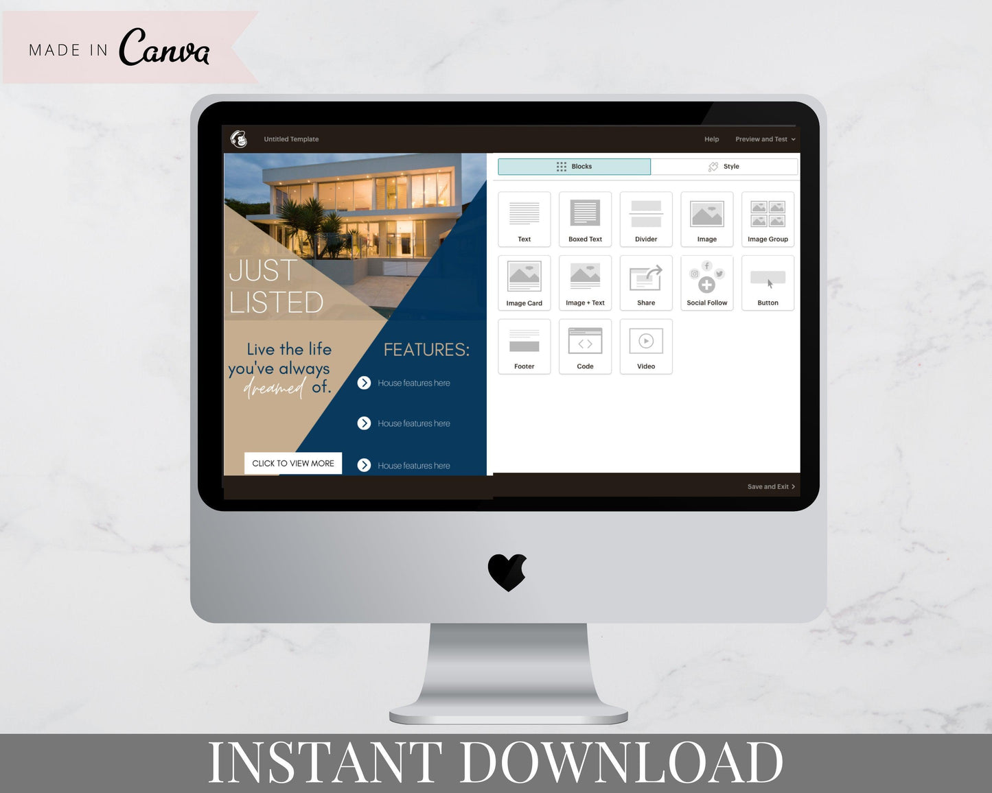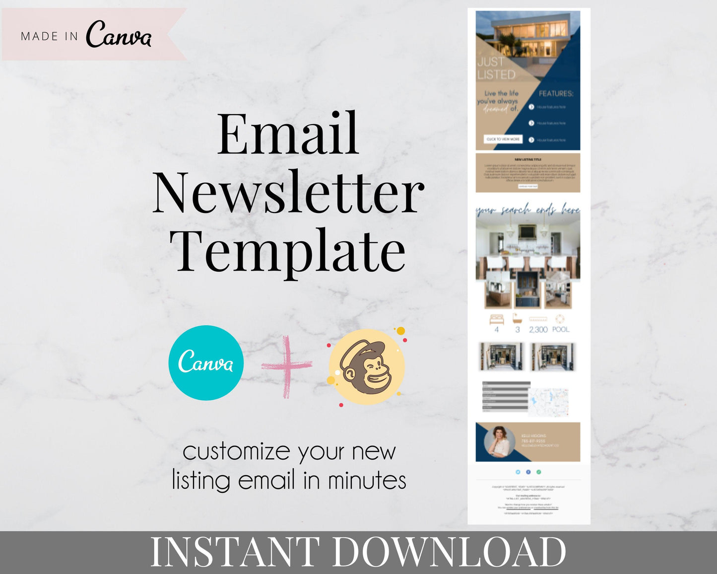 This Template is sized for MailChimp however you can easily resize it for any email software. All you need to do is open the template in Canva, update the images and listing information, and download. Then you sign in to MailChimp and upload your Canva images into the newsletter campaign.