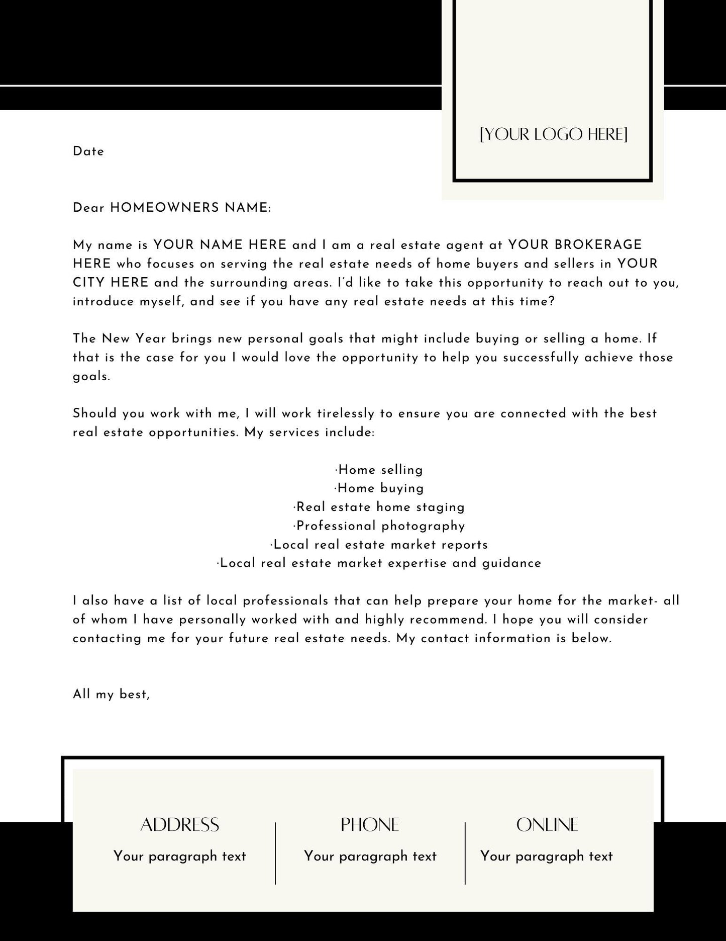 Attention real estate agents: Are you wanting to introduce yourself to the neighborhood as the area expert, say happy holidays to your past clients, and wish everyone a Happy New Year, this is your letter!