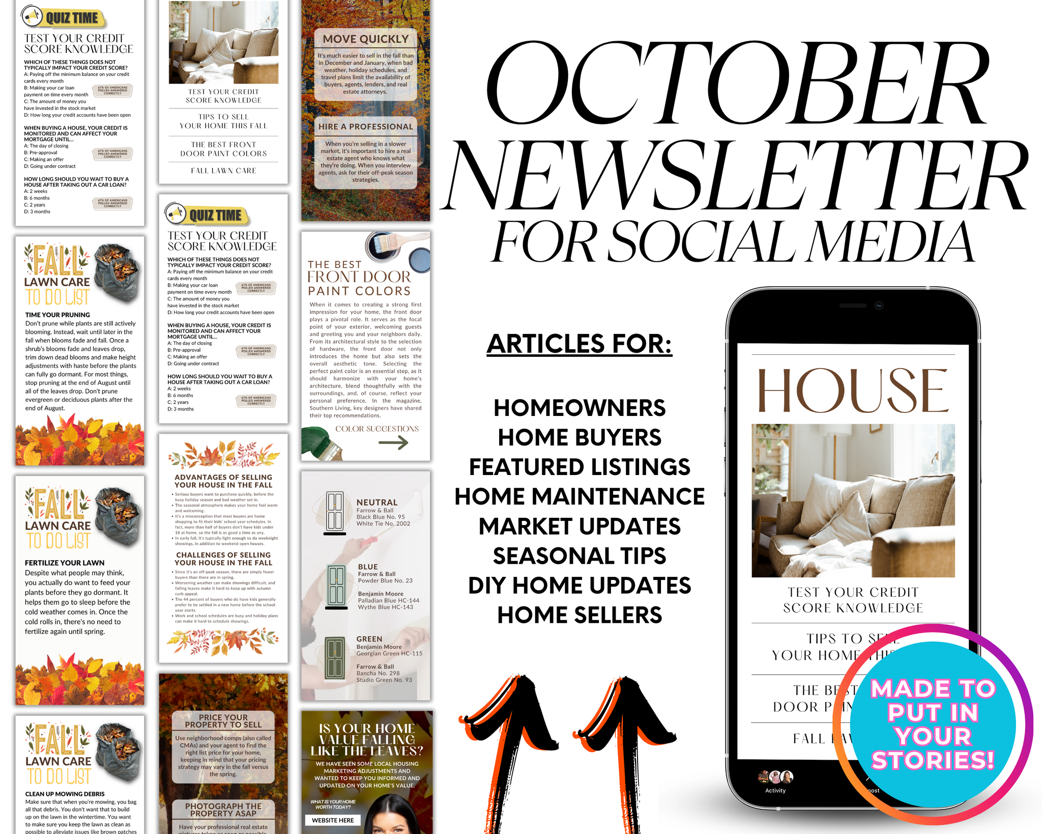 This real estate October 2024 story newsletter template is not just a tool for communication, it’s a key part of your marketing strategy! Designed to engage, inform, and convert leads into loyal clients, this template helps you stay top-of-mind with your audience.