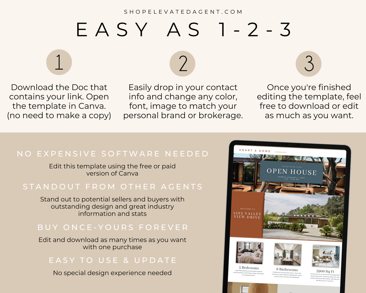 Attention Real Estate Agents! Keep your real estate marketing fresh and updated with this easy-to-use Realtor Canva Template designed by Elevated Agent. We stay on top of real estate marketing trends and produce new content daily.