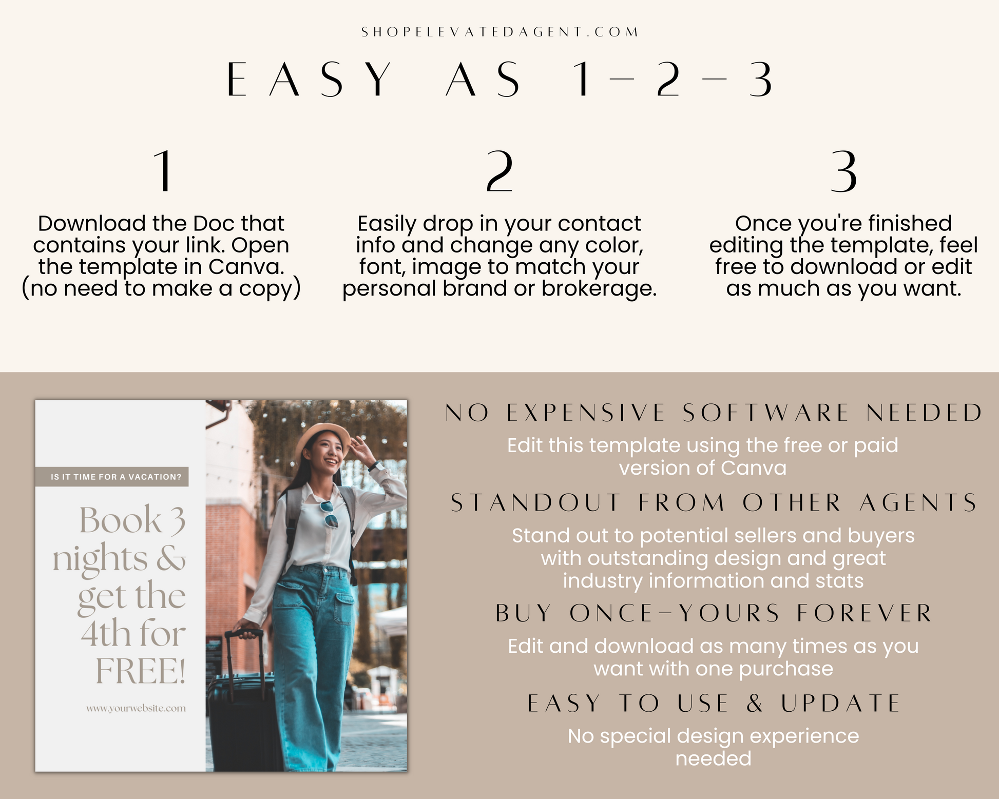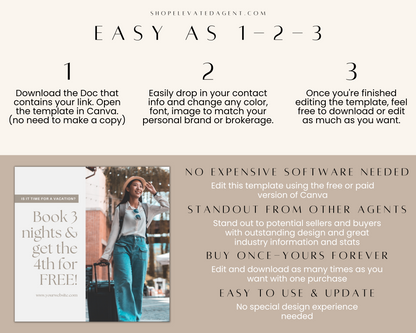 This Real Estate Template – Peaceful Airbnb Social Media Posts 1 can be edited to include the image of your Airbnb property and property-specific details. You can also share the graphics on social media, add them to text messages, email the digital file to your guests, or have it as part of your listing.
