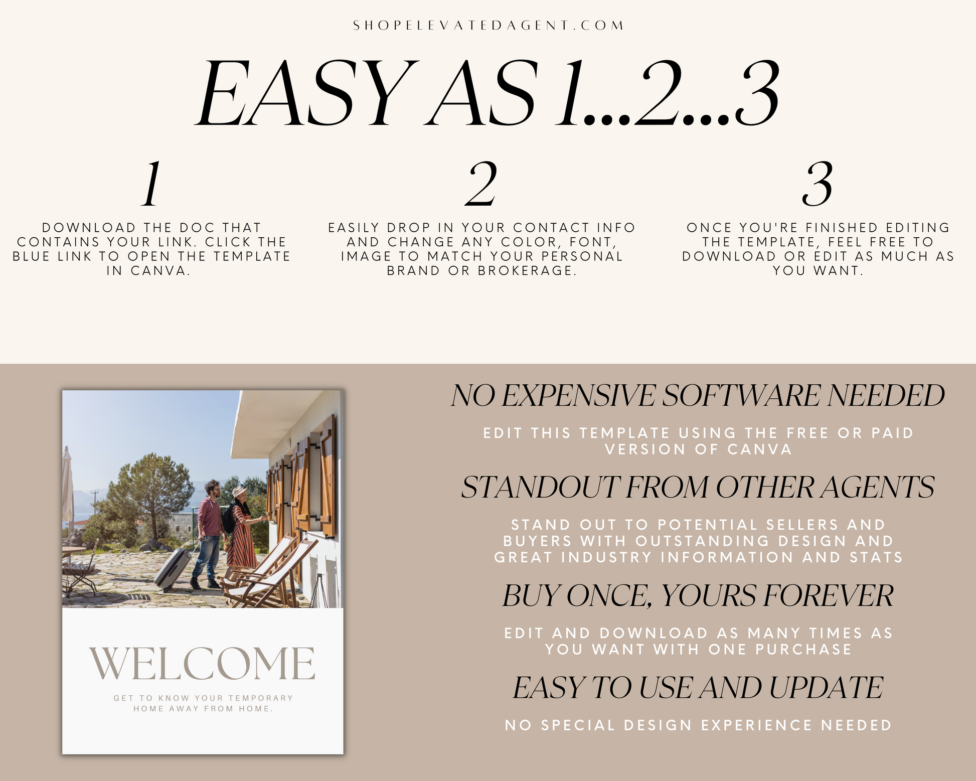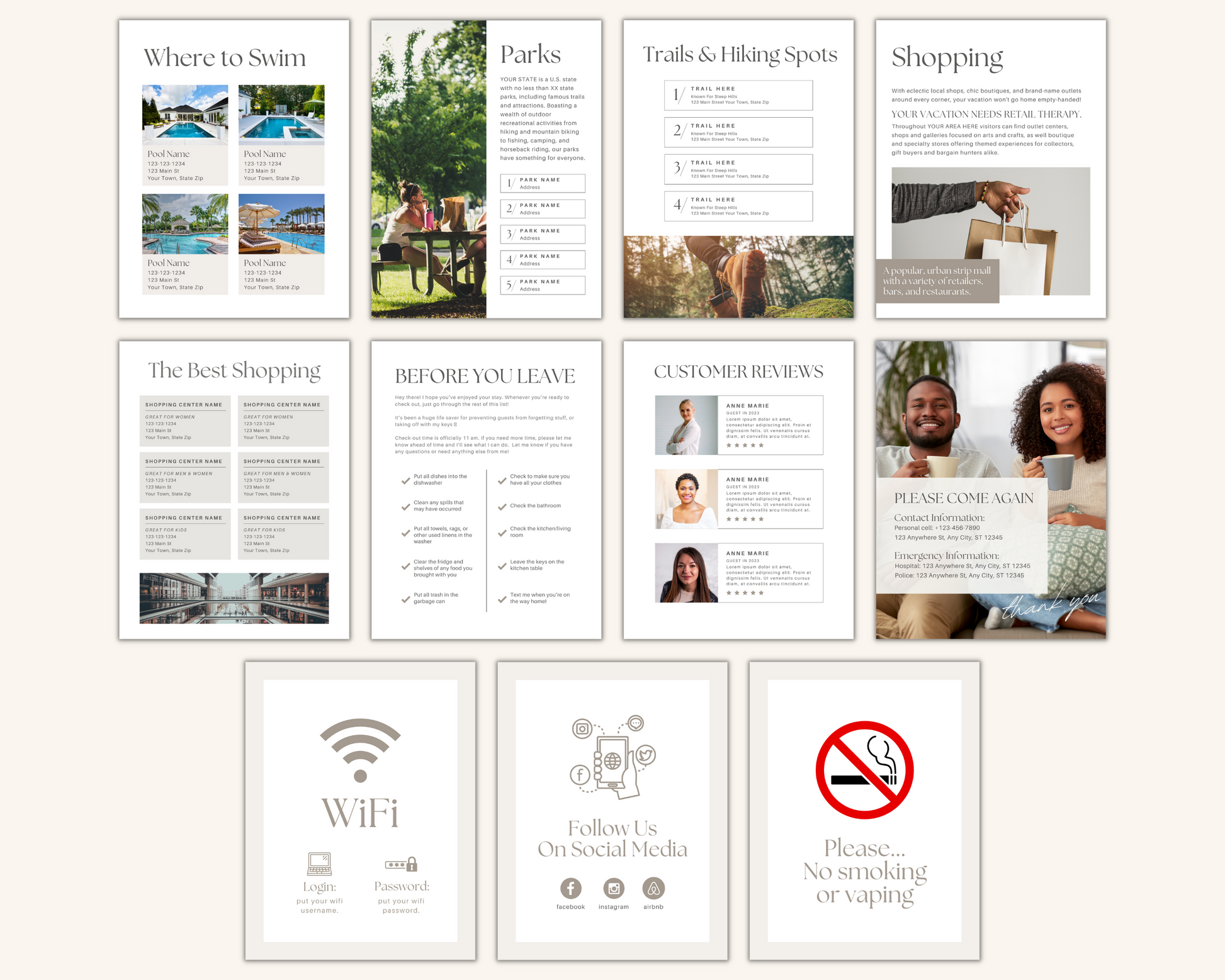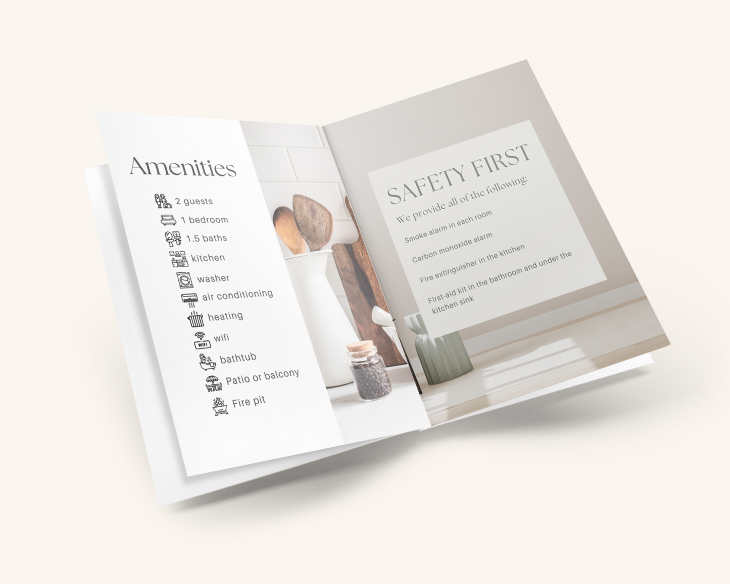 This Real Estate Template – Peaceful Airbnb Welcome Book can be printed at a local printer to leave at the property for the guests to enjoy. You can also email the digital file to your guests or have it as part of your listing.