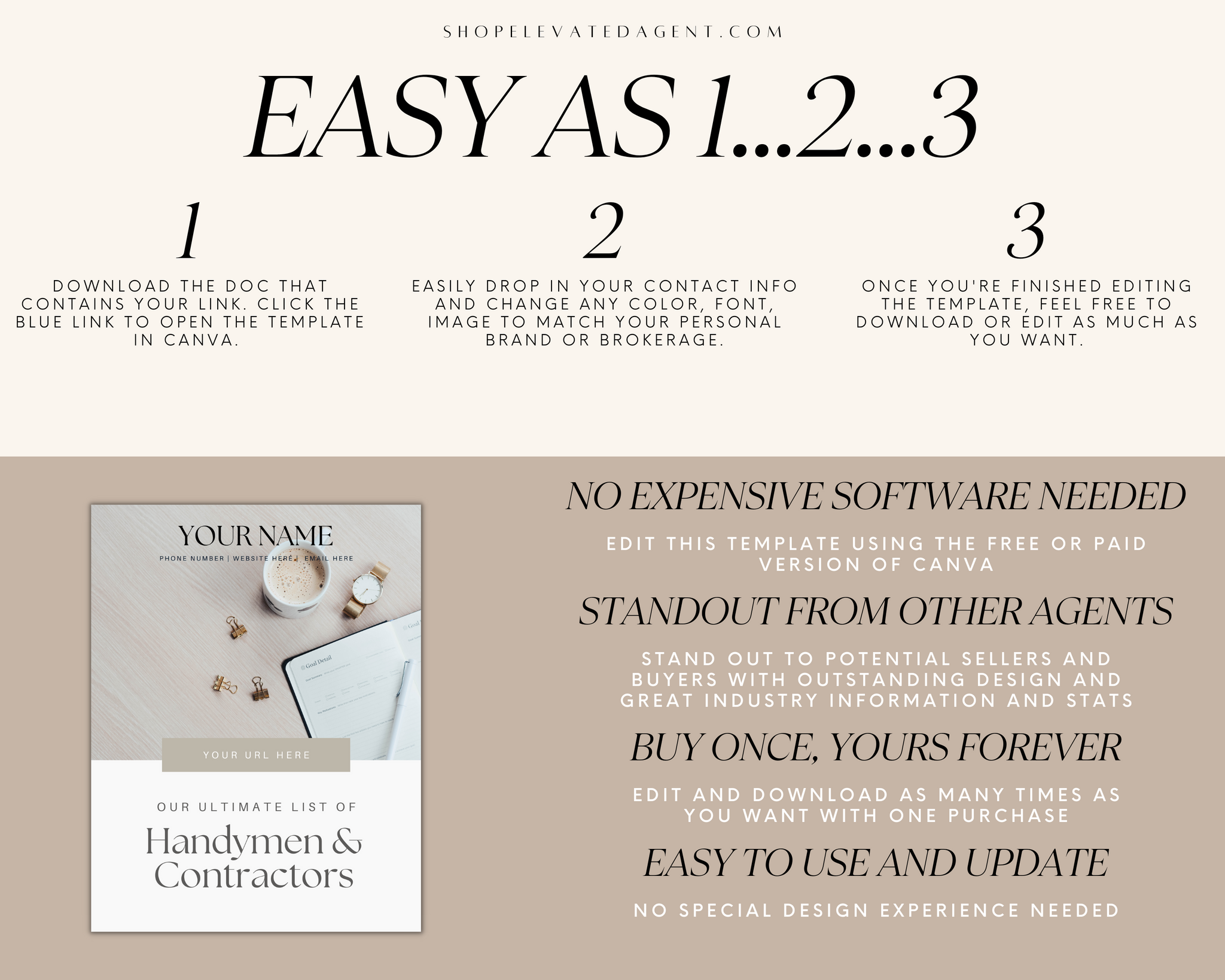 Attention Real Estate Agents! Keep your real estate marketing fresh and updated with this easy-to-use Realtor Canva Template designed by Elevated Agent. We stay on top of real estate marketing trends and produce new content daily.