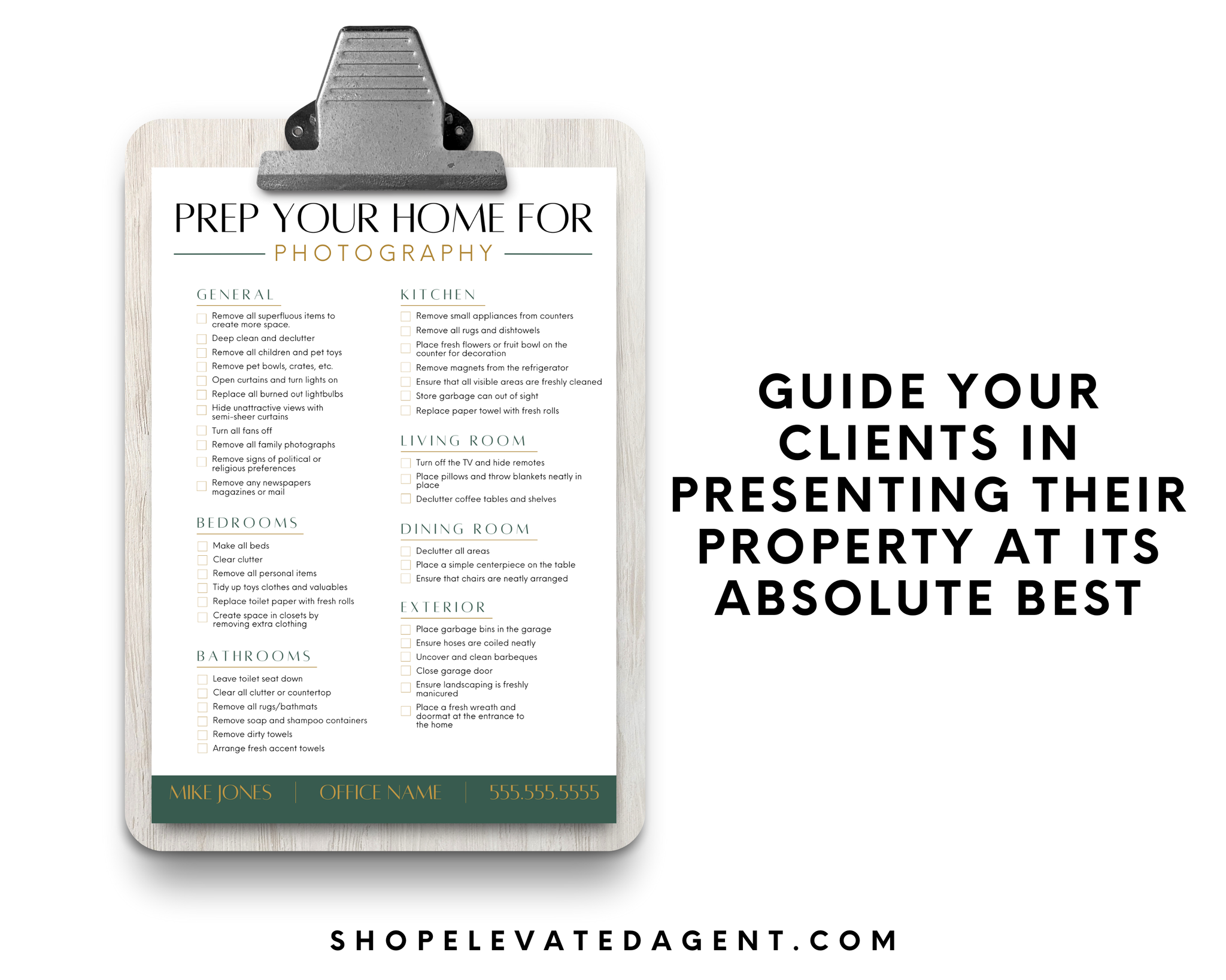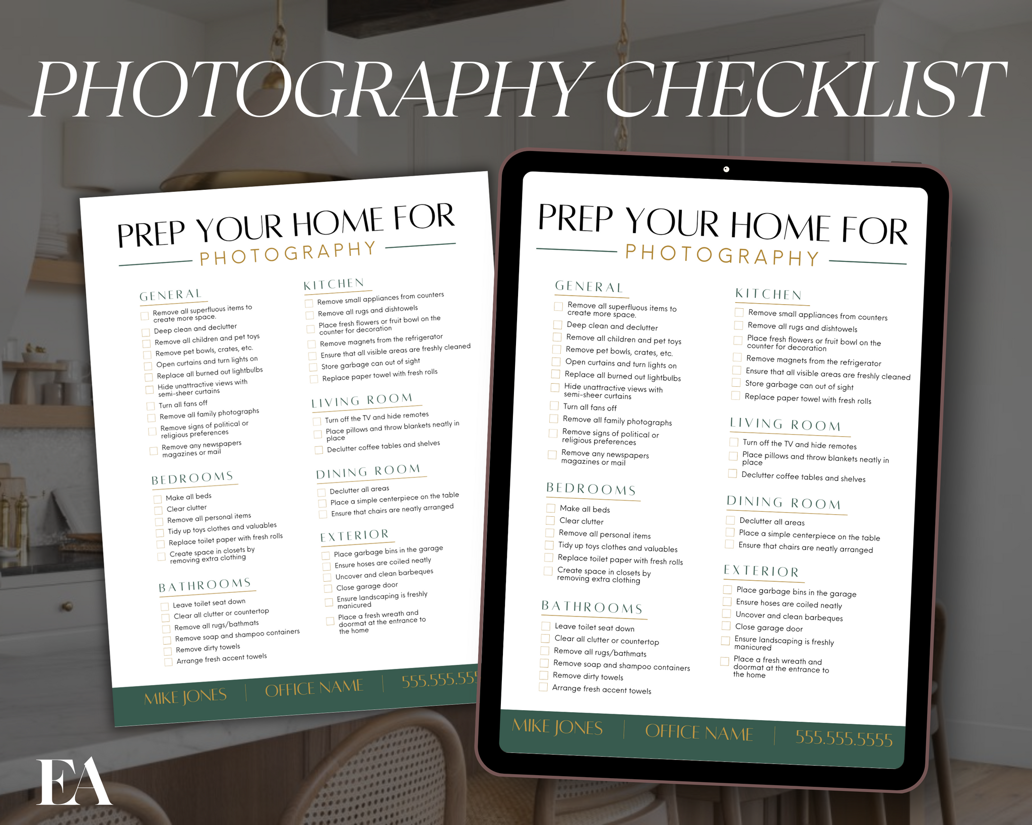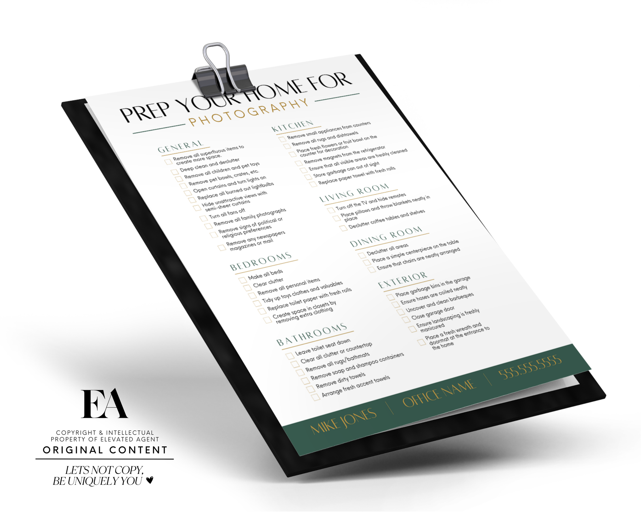 Help your clients prepare their properties like a pro, saving time and ensuring every listing stands out. With clear instructions and a visually appealing design, this checklist simplifies the photography preparation process, making it a must-have for any real estate professional.