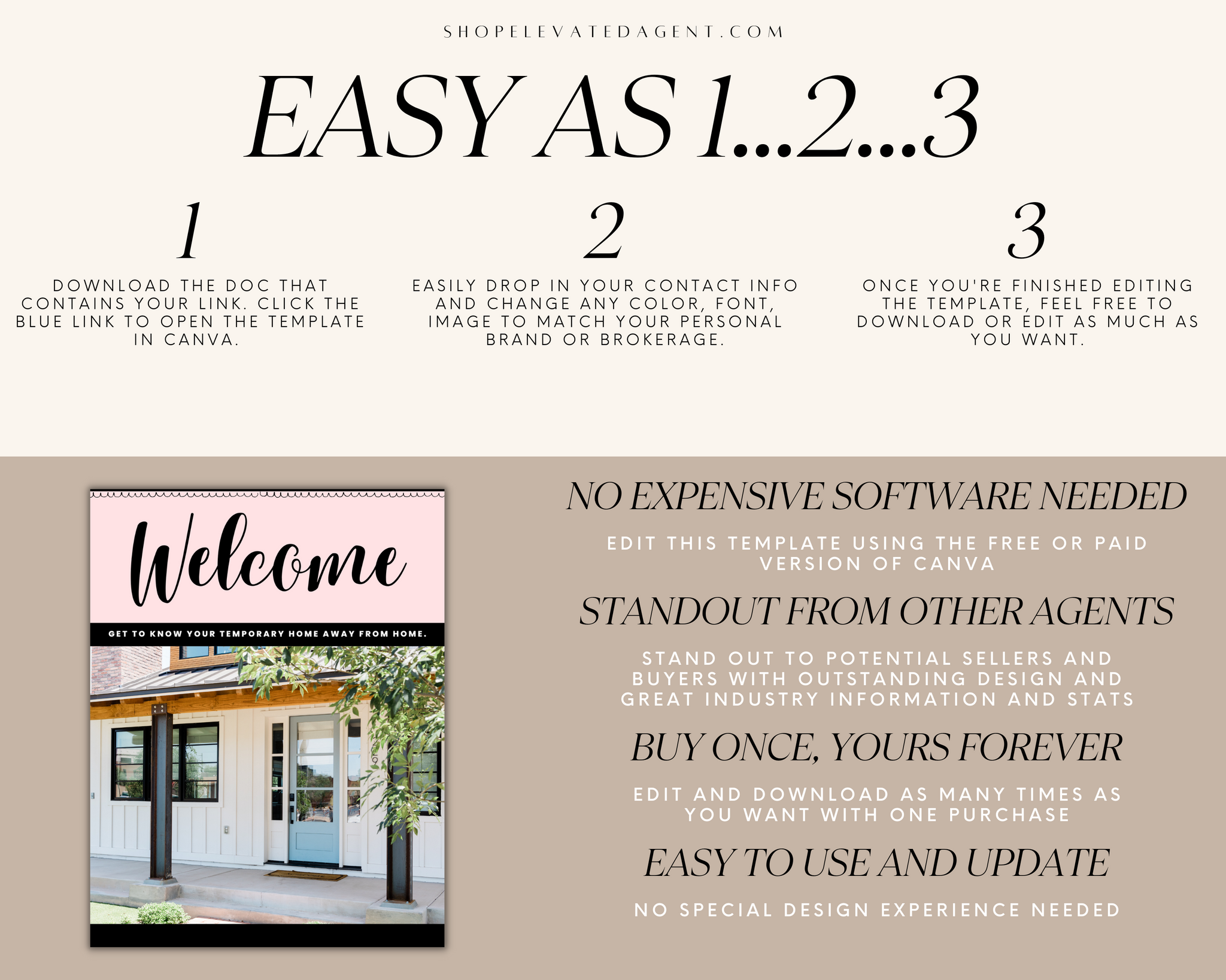 Keep your real estate marketing fresh and updated with this easy-to-use Real Estate Template in Canva designed by Elevated Agent. We stay on top of real estate marketing trends and produce new content daily.