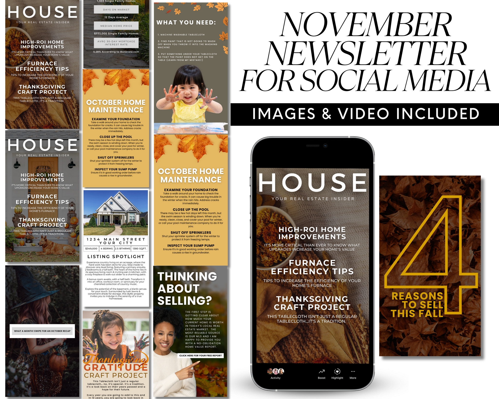 Capture the essence of fall with our stunning November Newsletter for Social Media Template, thoughtfully crafted for real estate professionals like you!