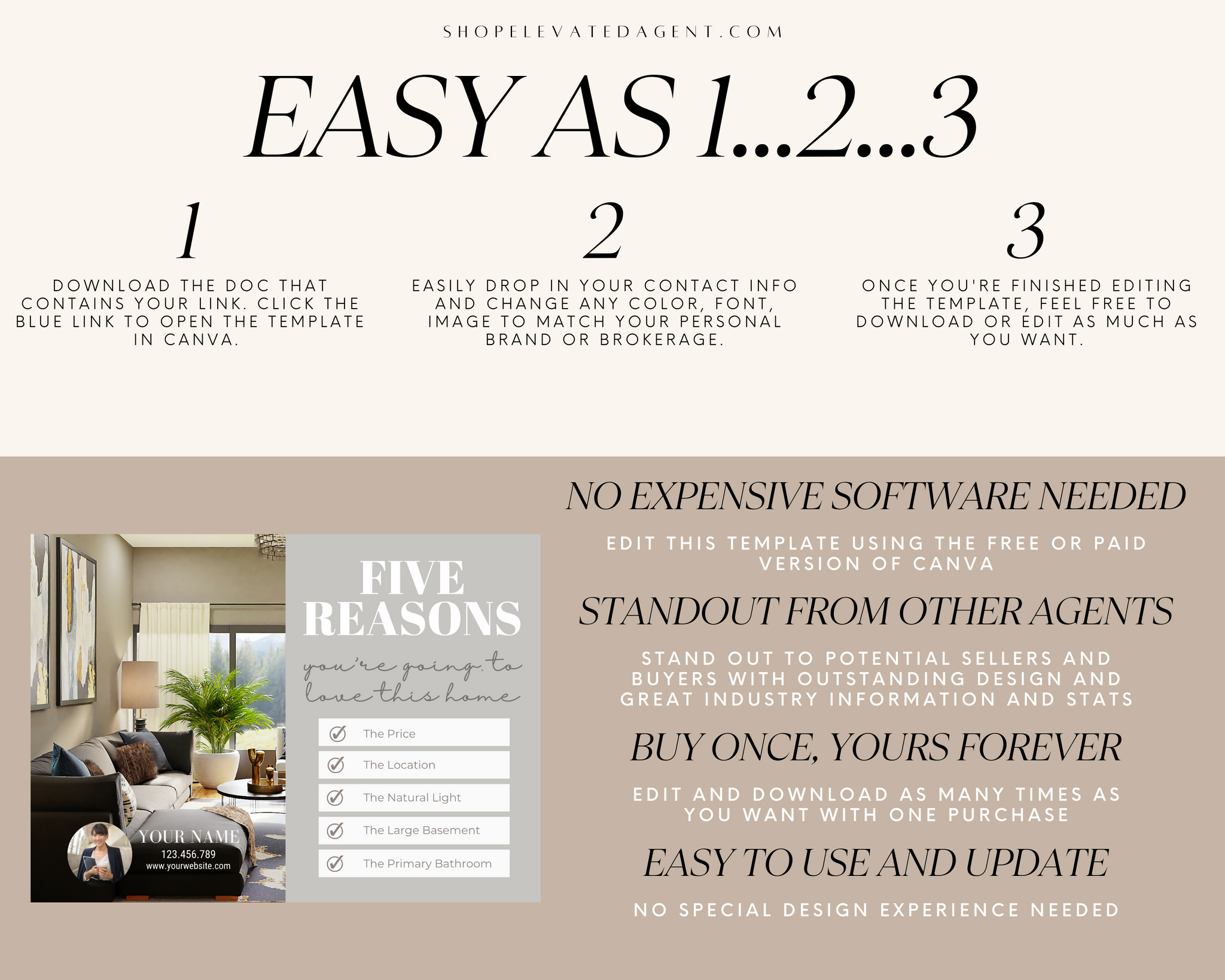 Keep your real estate marketing fresh and updated with this easy-to-use Real Estate Template in Canva designed by Elevated Agent. We stay on top of real estate marketing trends and produce new content daily.