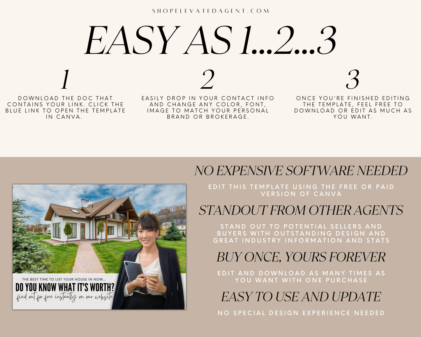 Keep your real estate marketing fresh and updated with this easy-to-use Real Estate Template in Canva designed by Elevated Agent. We stay on top of real estate marketing trends and produce new content daily.