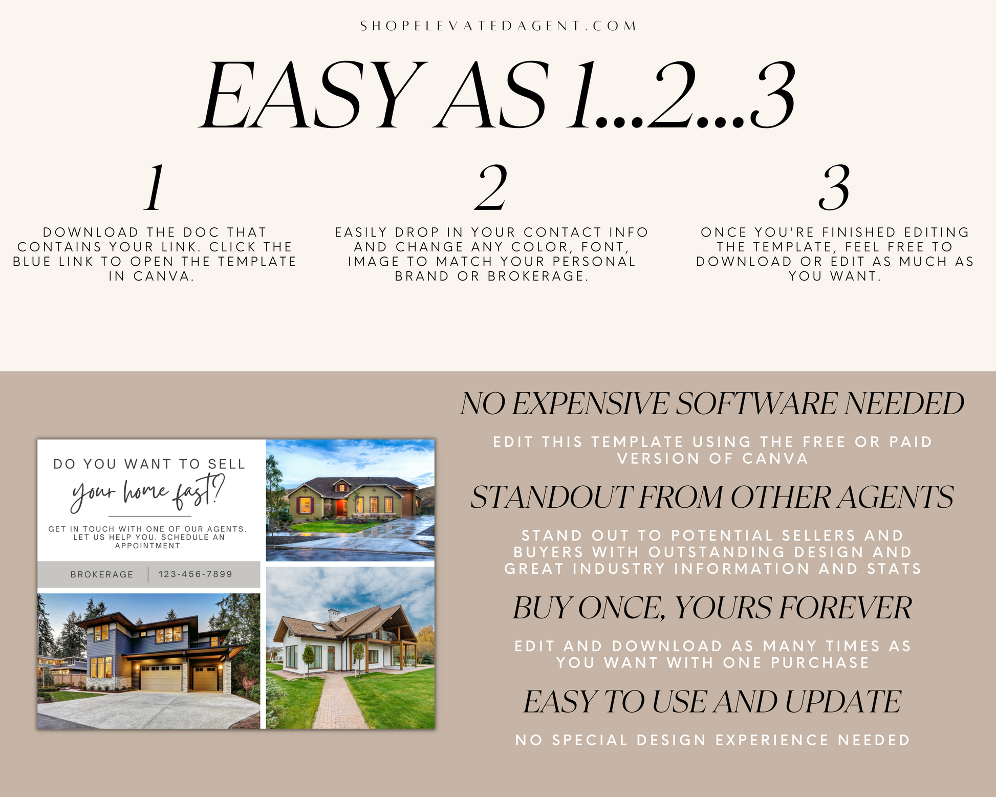 Keep your real estate marketing fresh and updated with this easy-to-use Real Estate Template in Canva designed by Elevated Agent. We stay on top of real estate marketing trends and produce new content daily.
