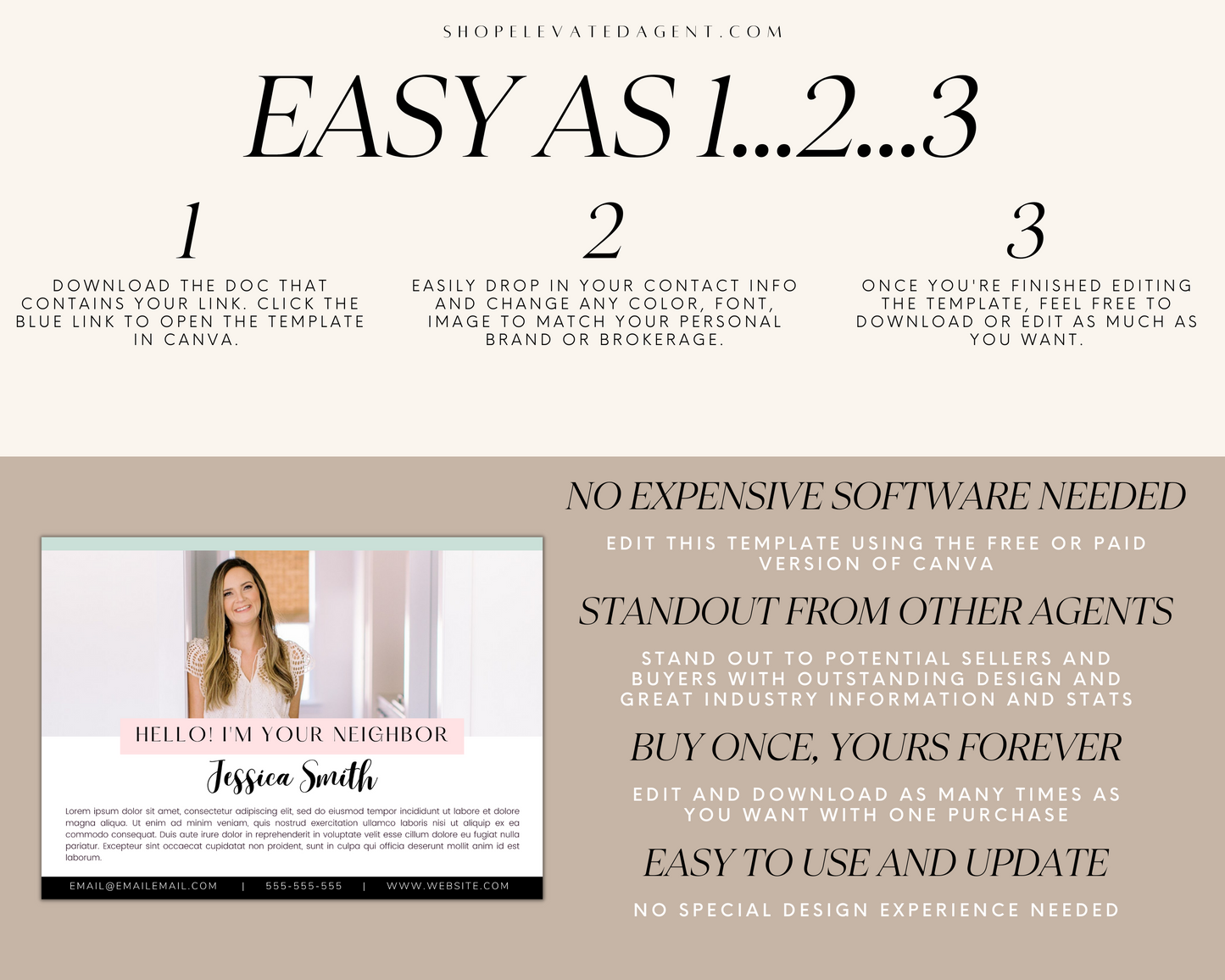 Keep your real estate marketing fresh and updated with this easy-to-use Real Estate Template in Canva designed by Elevated Agent. We stay on top of real estate marketing trends and produce new content daily.
