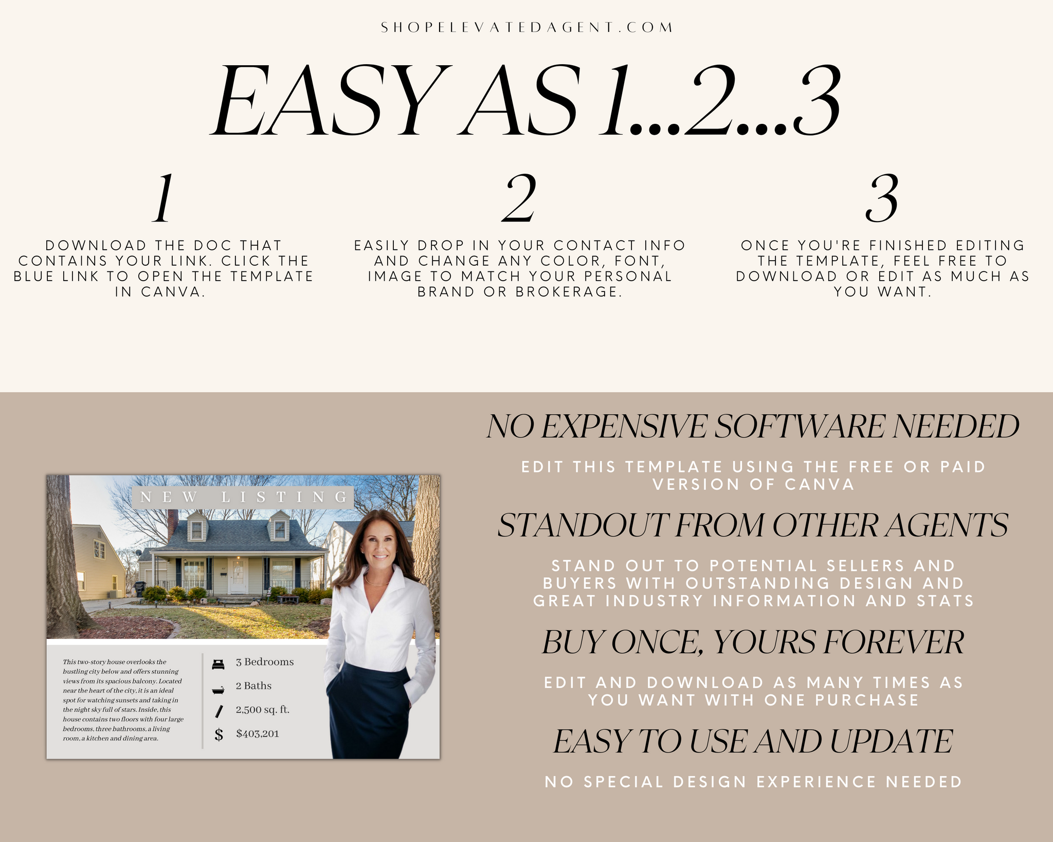 Keep your real estate marketing fresh and updated with this easy-to-use Real Estate Template in Canva designed by Elevated Agent. We stay on top of real estate marketing trends and produce new content daily.