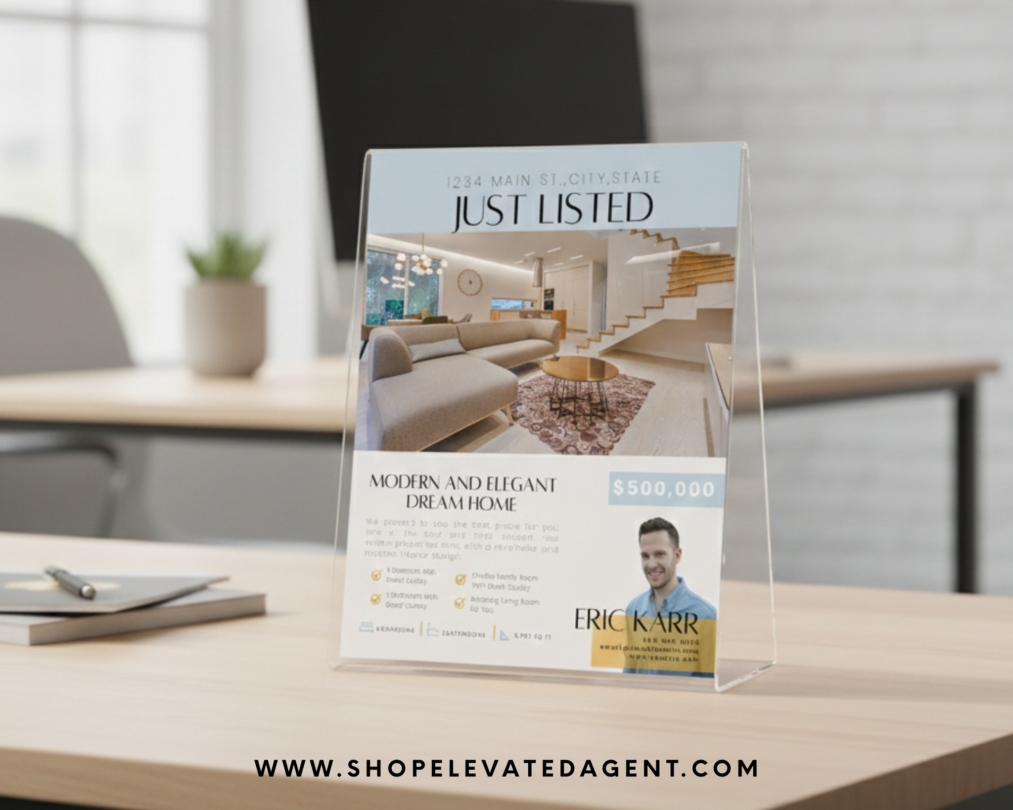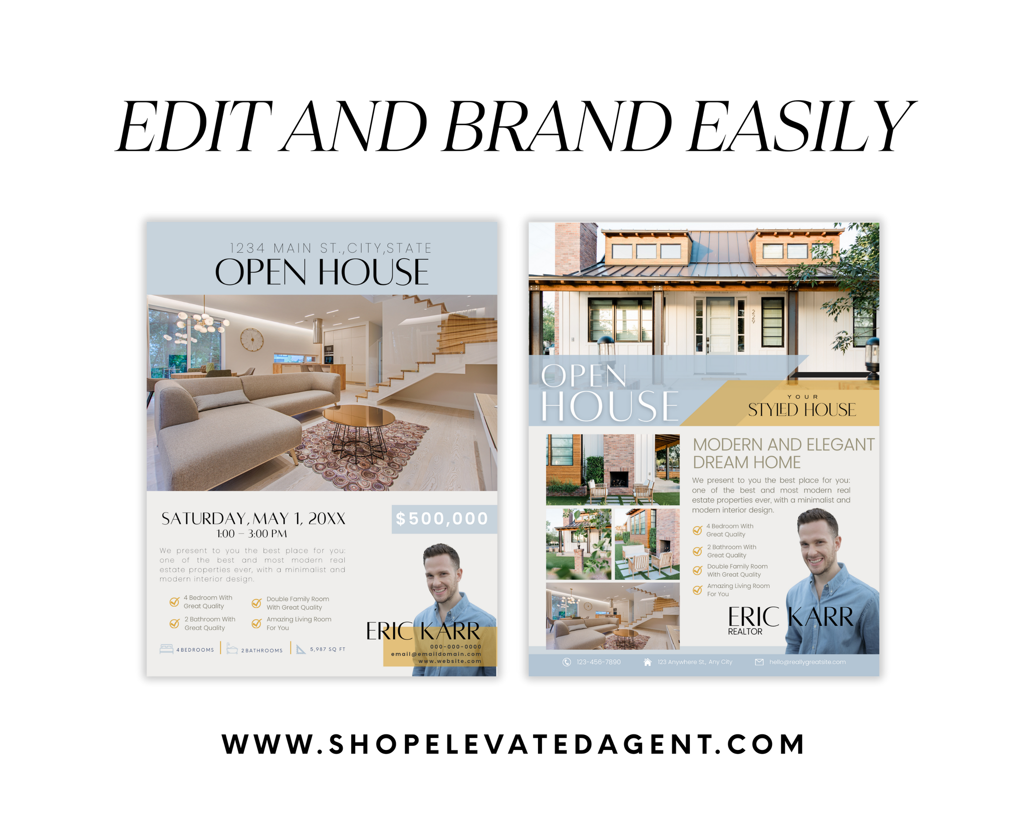 Created in Canva, this template allows you to customize every element to match your branding and each property. From photos and pricing to descriptions and agent details, everything can be edited quickly, making this a reusable marketing tool for ongoing listings.