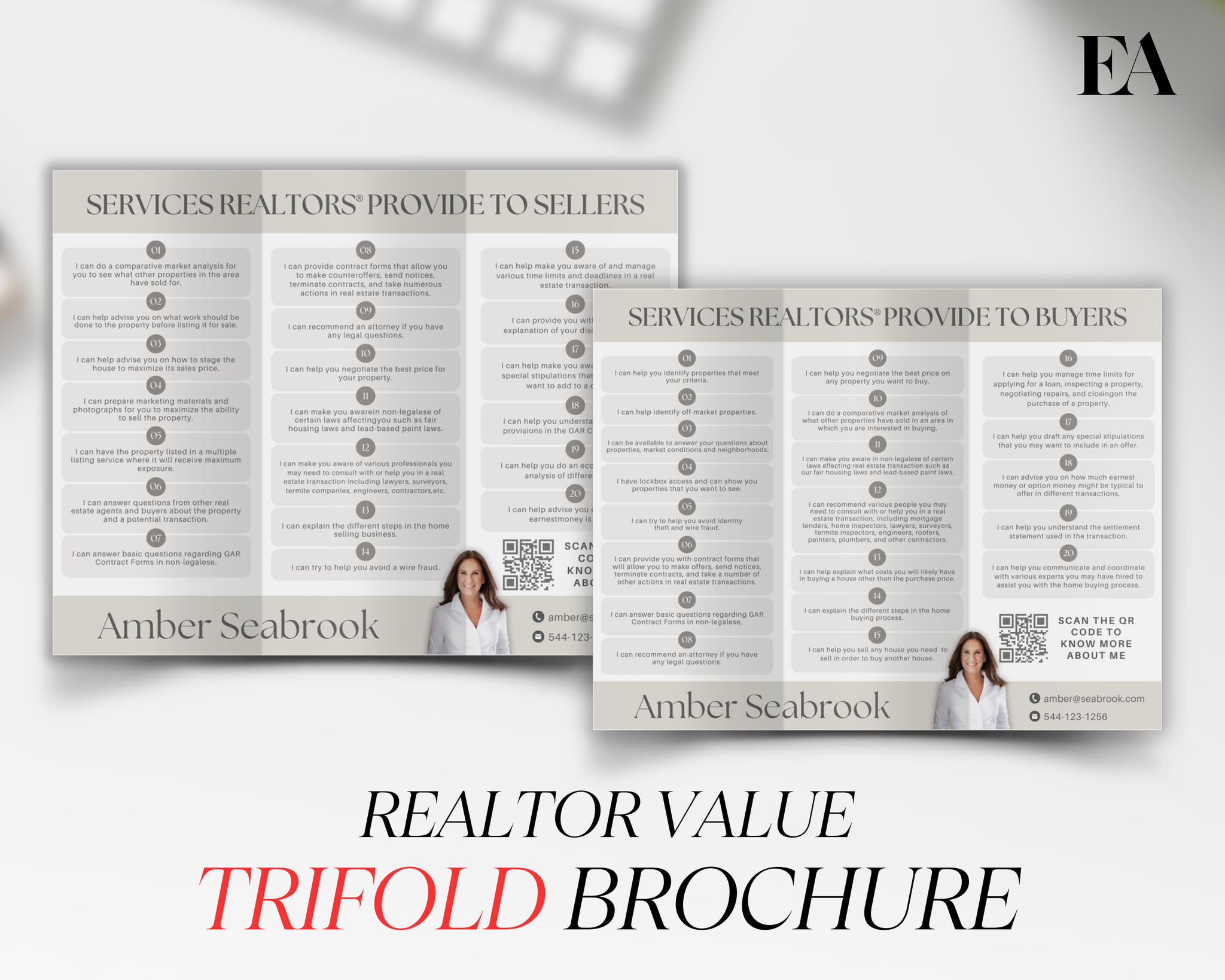 Present your real estate services with style and confidence using our Realtor Value Trifold Brochure Template! Tailored for real estate agents, this professionally designed, printable template helps you convey your expertise and value to clients in a visually engaging, easy-to-read format. Customize it effortlessly in Canva to align with your brand’s colors, fonts, and personality!