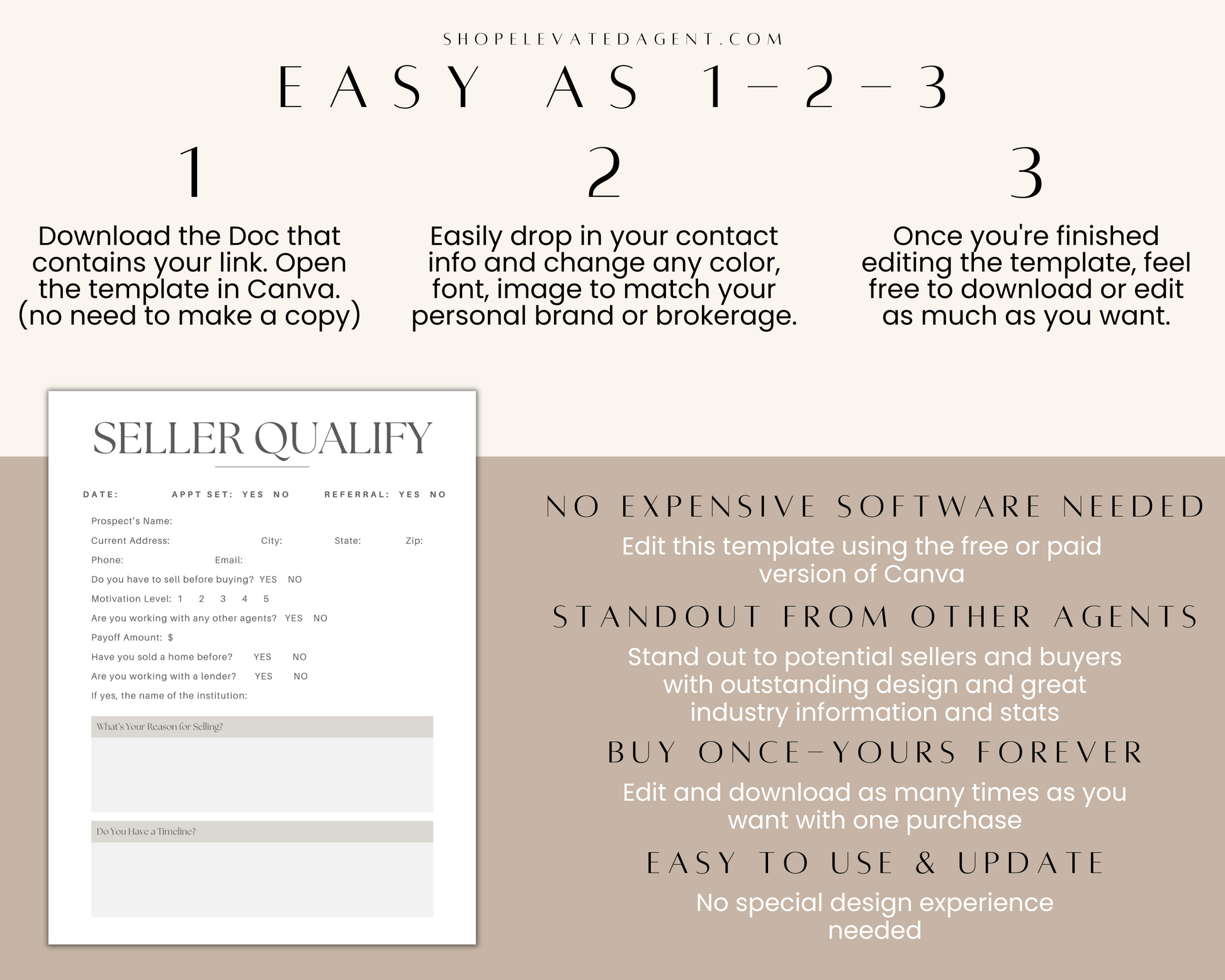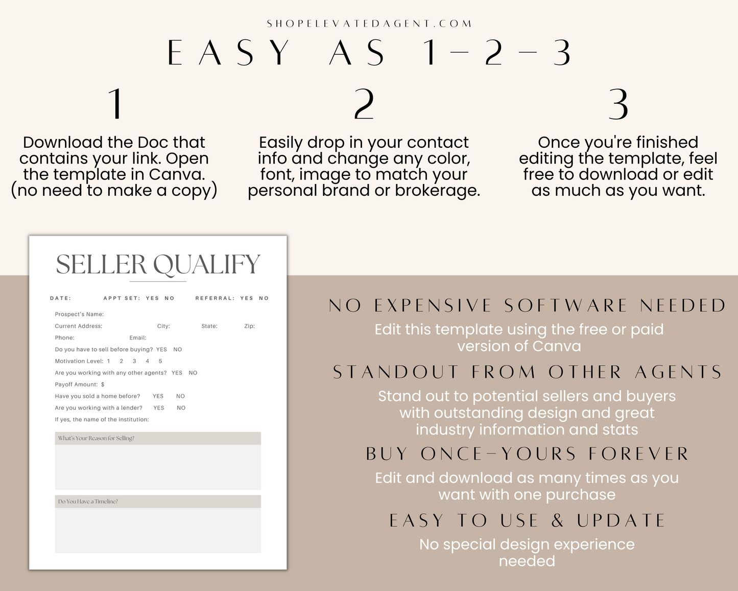 Attention Real Estate Agents! Keep your real estate marketing fresh and updated with this easy-to-use Realtor Canva Template designed by Elevated Agent. We stay on top of real estate marketing trends and produce new content daily.