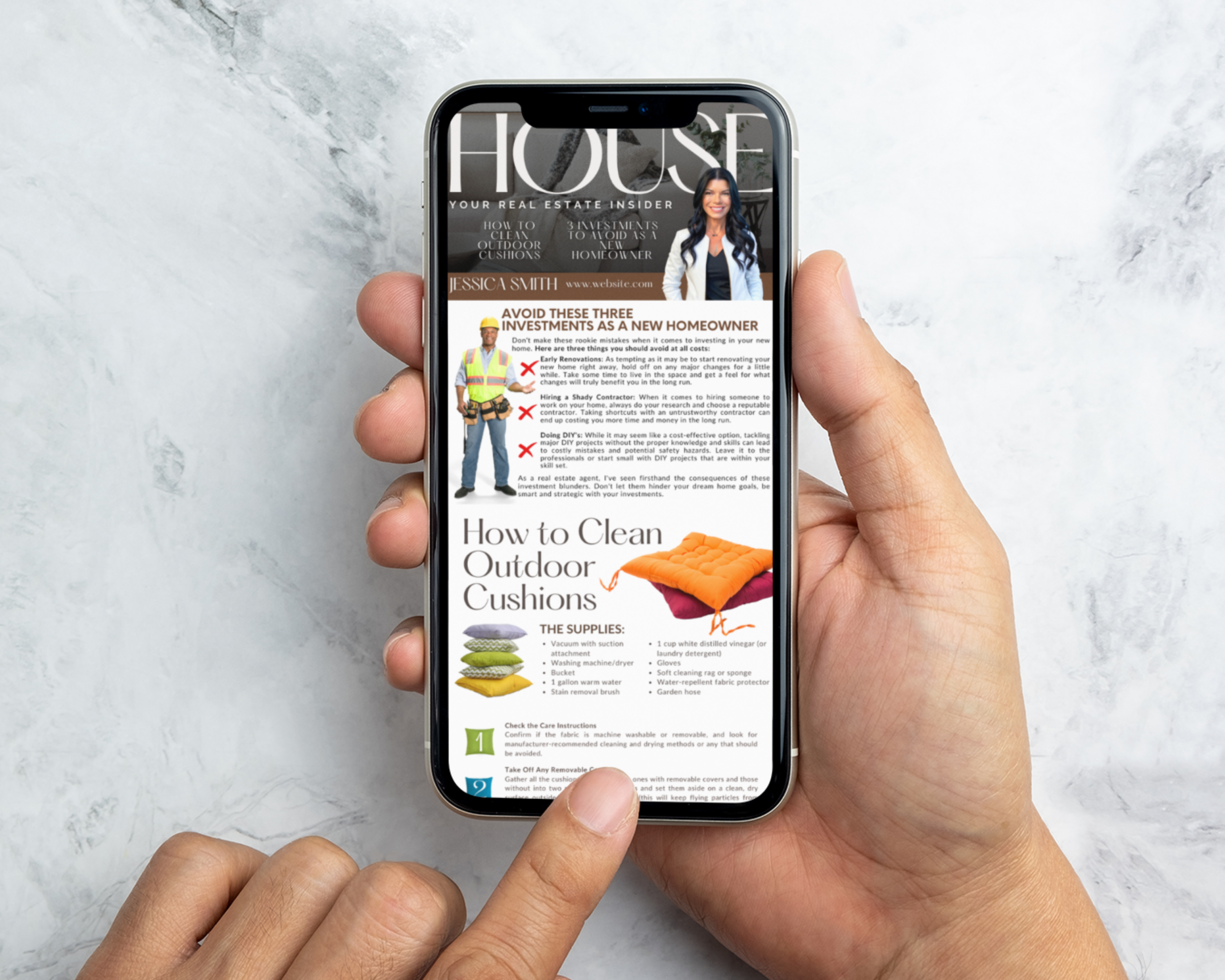 Engage Your Audience: Share market updates, featured listings, neighborhood news, and tips for homebuyers or sellers in a visually appealing format that keeps your clients engaged.